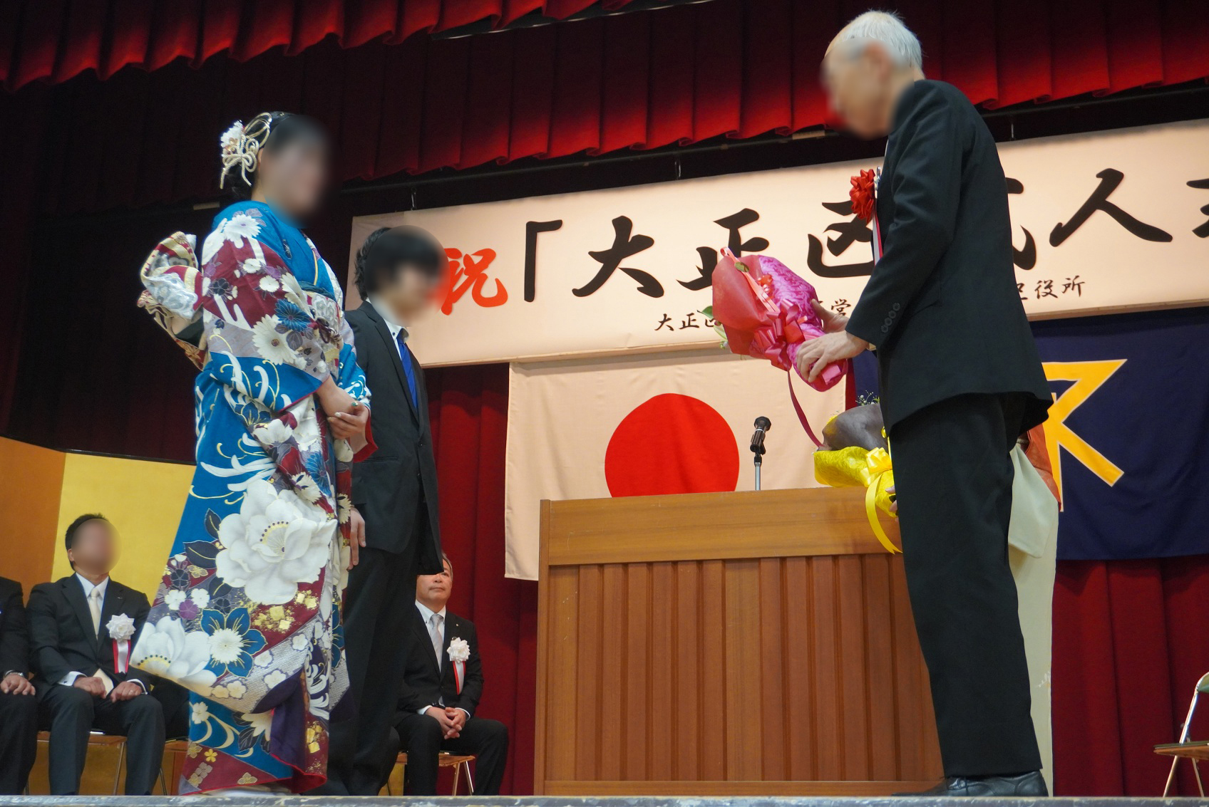 第1部の最後には、新成人代表のお二方が「誓いのことば」として周囲への感謝と、今後の決意を語られ、大正区地域女性団体協議会の谷田会長、大阪大正ライオンズクラブの菅野幹事より、花束が贈呈されました!