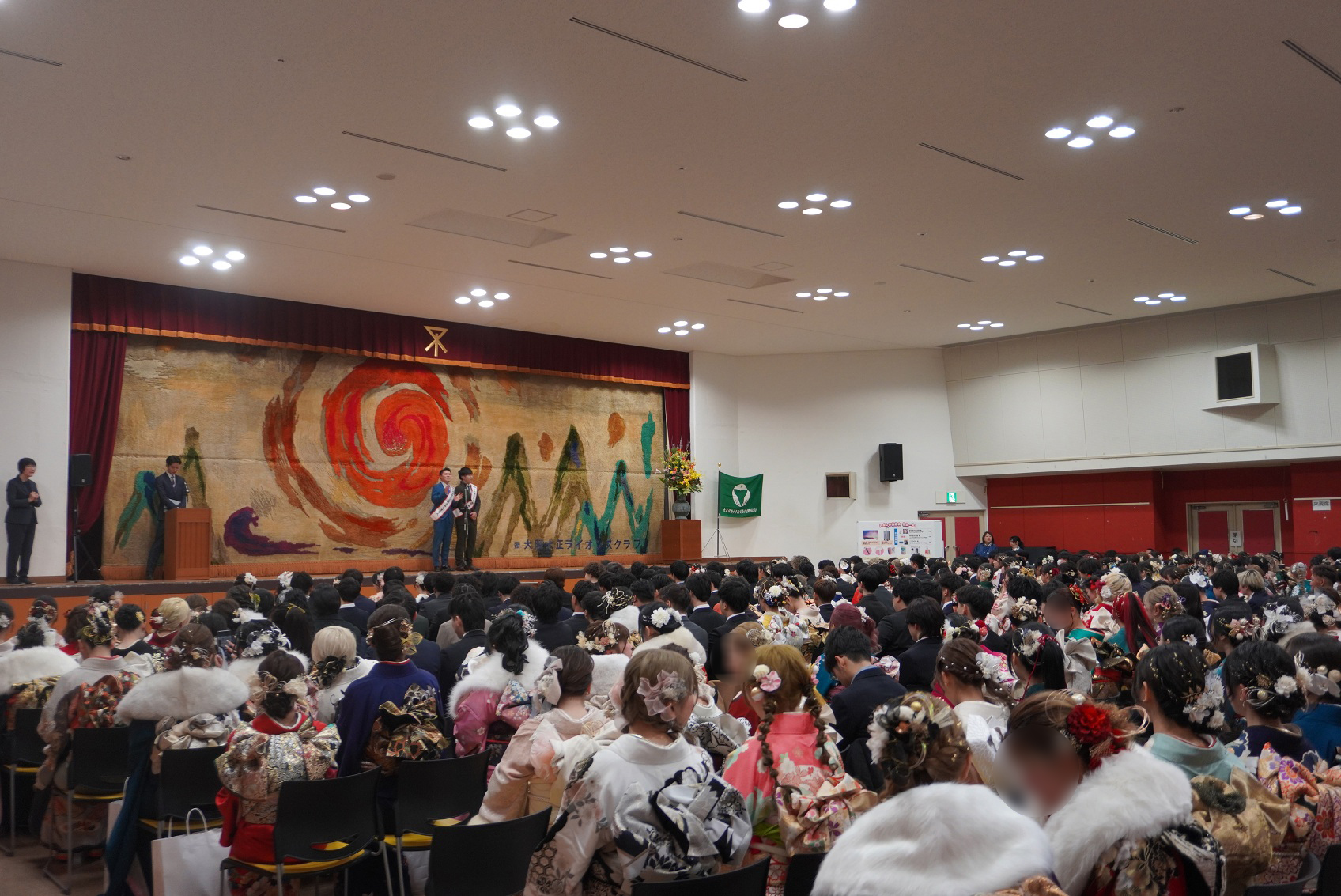 当日は、400名を超える新成人の皆様が参加され、第1部の記念式典では、「大正区成人式」運営委員会の座覇運営委員長と村田大正区長より、温かいお祝いのごあいさつをいただきました。