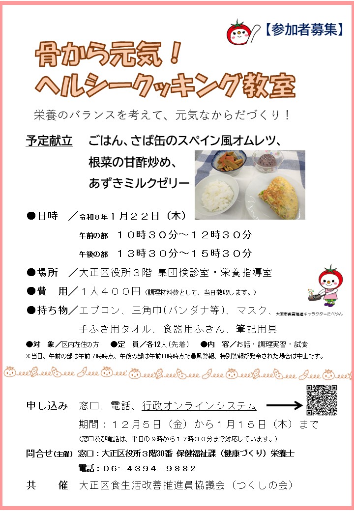 「骨から元気!ヘルシークッキング教室」参加者募集