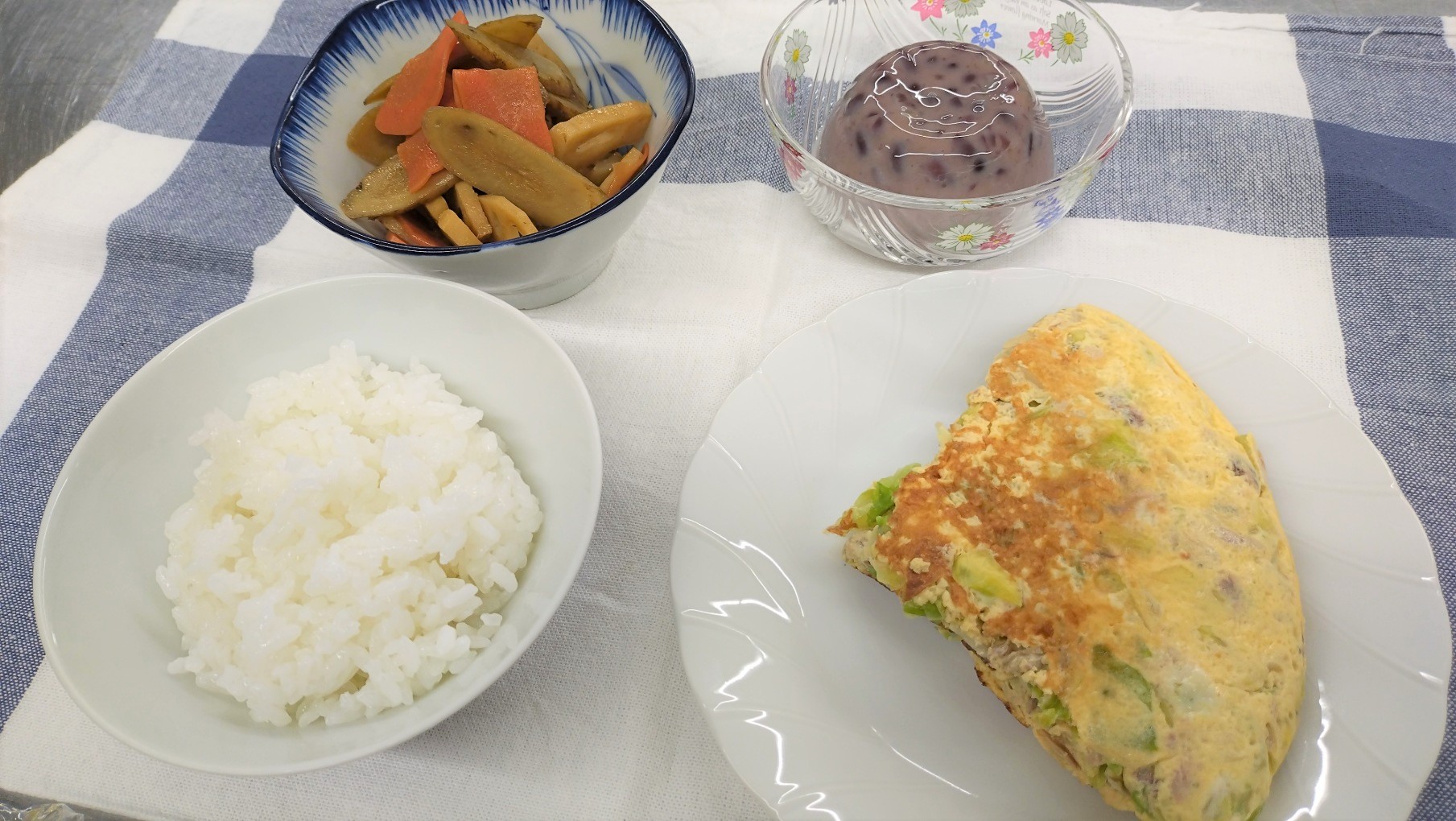 ごはん、さば缶のスペイン風オムレツ、根菜の甘酢炒め、あずきミルクゼリー