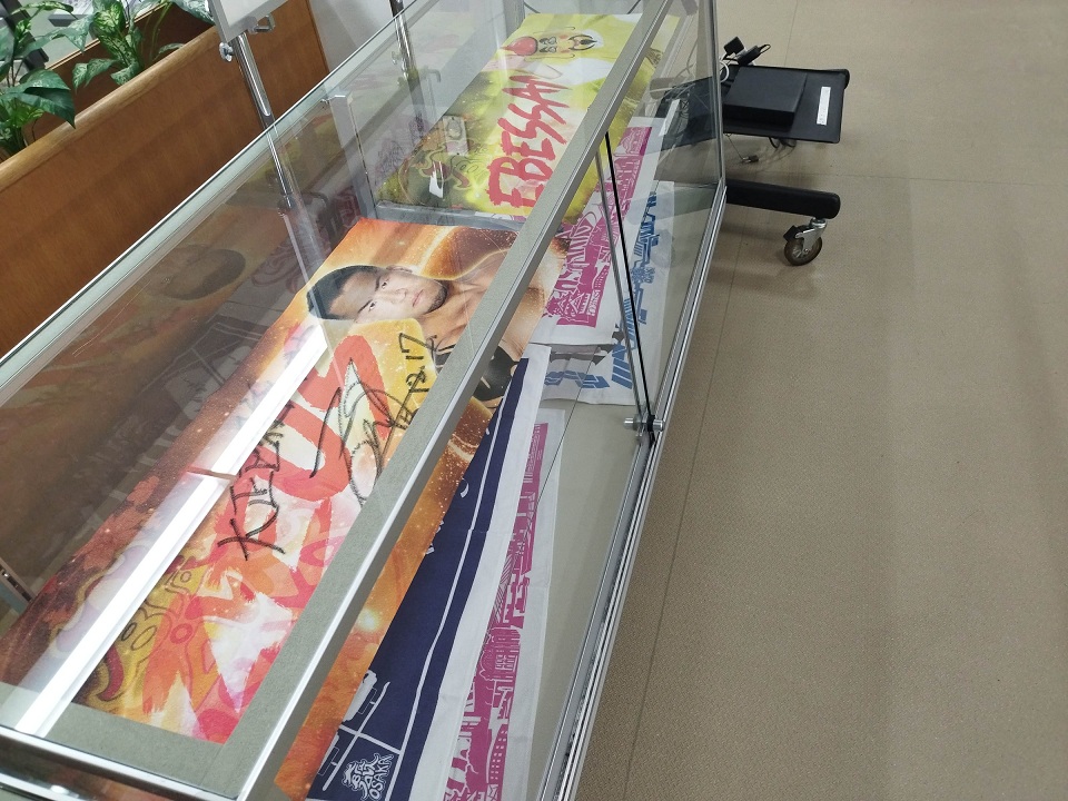 「ゼウス選手」や「えべっさん選手」、「松房龍哉(まつふさりゅうや)選手」に「佐野蒼嵐(さのあらん)選手」のオリジナルタオルを展示していますので、みなさん、ぜひ見に来てください!