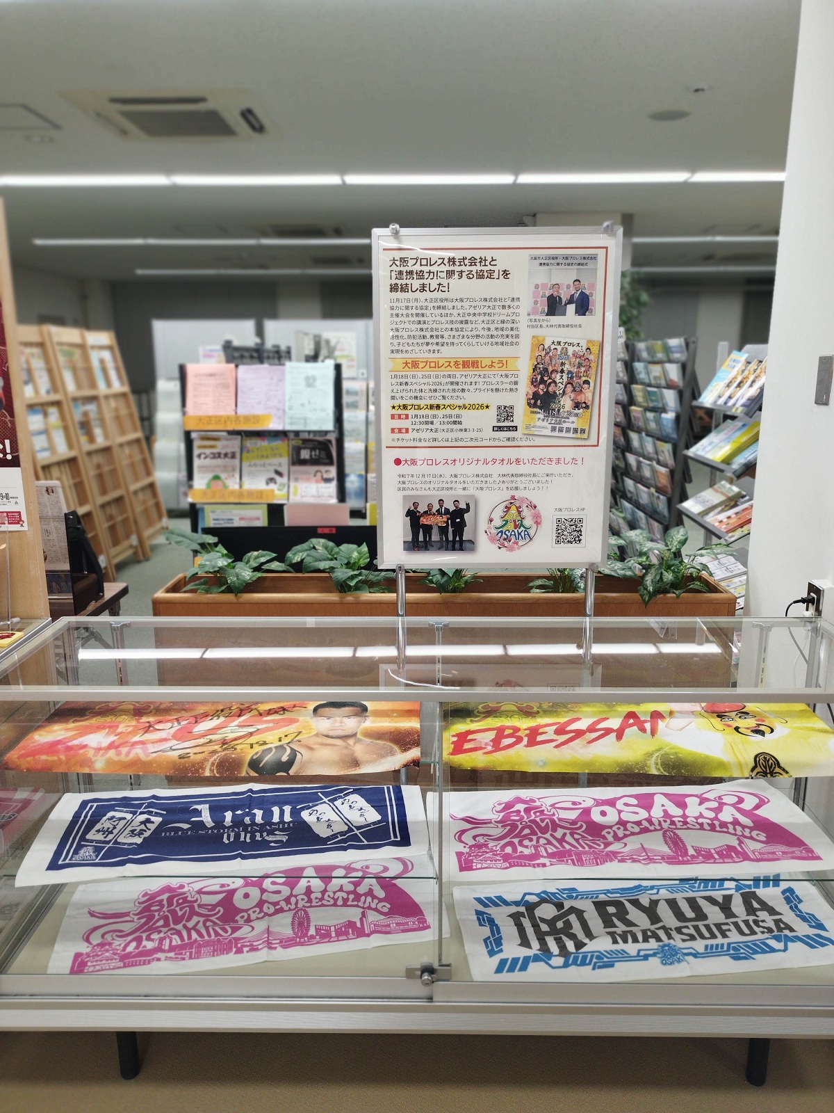 大正区役所2階「さわやか広場」で、大阪プロレスオリジナルタオル等を展示しています♪