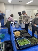 本日は「グリーナリー天王寺」の田原さんに講師をしていただきました。 講習内容が「種からつくる花づくり」だったので、実際に、土づくり、種蒔き、移植作業、底面給水等、日頃、区役所裏で行っている作業過程を、目の前で実習方式にて説明していただきました。目の前で、実際に土や肥料を使っての説明は分かりやすく、皆さんにも作業をしてもらい、どんな風に育てていくのかを体験してもらいました。最初は思うように作業ができず、苦戦していましたが、ポイントやコツを教えてもらいながら、最後は手慣れた様子で作業をしていました。