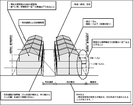既設の通路に沿って長屋などが建ち並ぶ区域において、一定のルールにもとづき協調的に建替えを進める場合、この区域全体を「ひとつの敷地」とみなし「接道規定」等が適用されるため、個別の建替えができるようになる制度です。