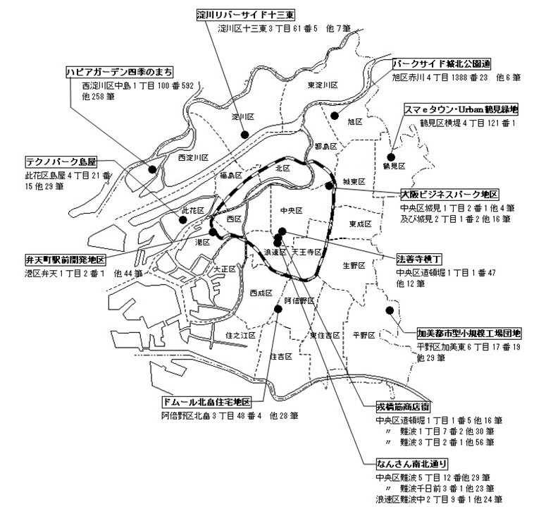 大阪市内で建築協定を結んでいる地域の位置図