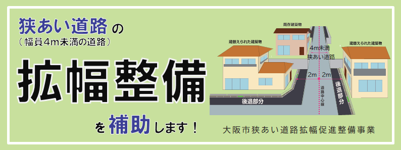 大阪市では、このような密集住宅市街地における防災性及び住環境の向上を図り、安全で快適なまちづくりを推進するため、特に優先的な取り組みが必要な区域を定め、幅員4メートル未満の狭あい道路において、建築主等が建築基準法で定められた4メートルの幅にするために道路中心線から2メートル後退された部分の道路舗装等を行う場合に、本市が補助する狭あい道路拡幅促進整備事業を実施しています。