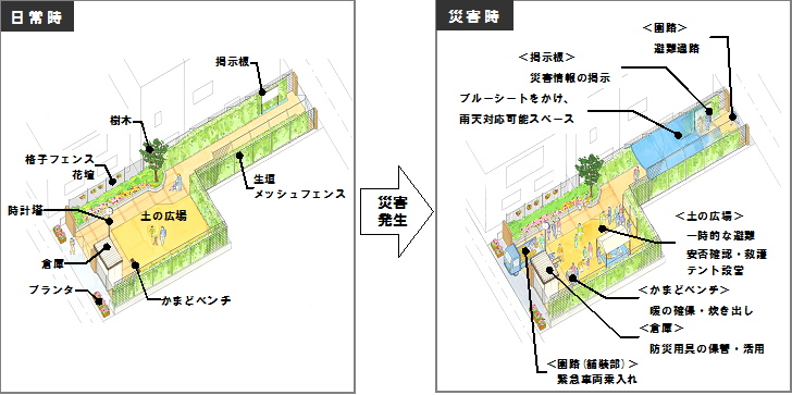 まちかど広場は、日ごろは地域防災活動やコミュニティを育む地域活動の場として、災害時は一時避難場所として使えるよう、地域と連携・協働して整備を進める広場です。広場の計画段階から、地域のみなさまによるワークショップにおいて意見を出しあっていただき、整備後も自主的な管理運営をしていただくことで、地域防災力の向上と地域コミュニティの活性化をめざしています。
