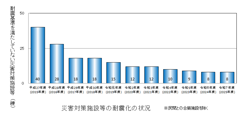 - 耐震基準を満たしていない災害対策施設等は、残り8棟となっています。