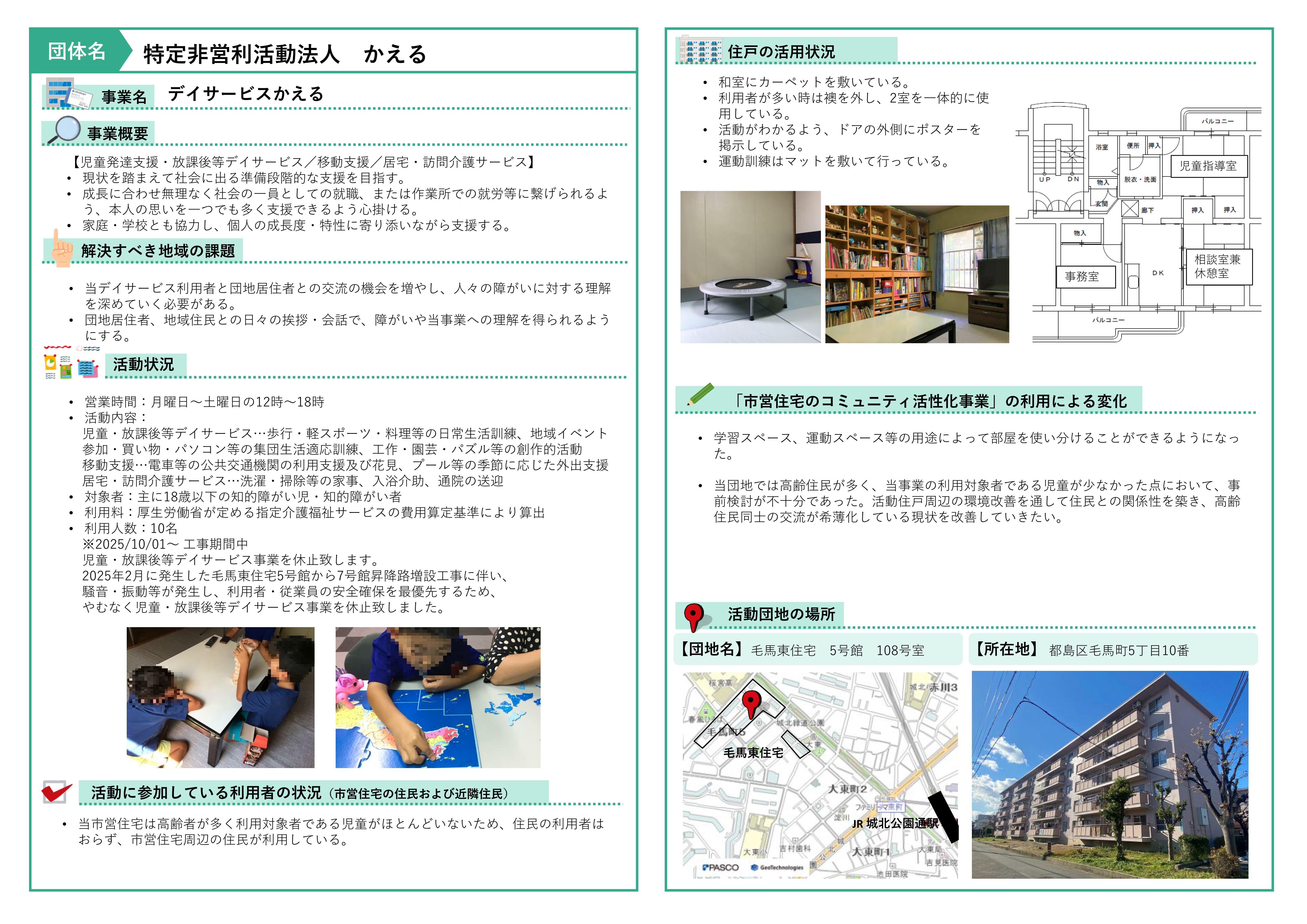 - 都島区 毛馬東住宅5号館108号室 特定非営利活動法人 かえる (事業区分 子育て)