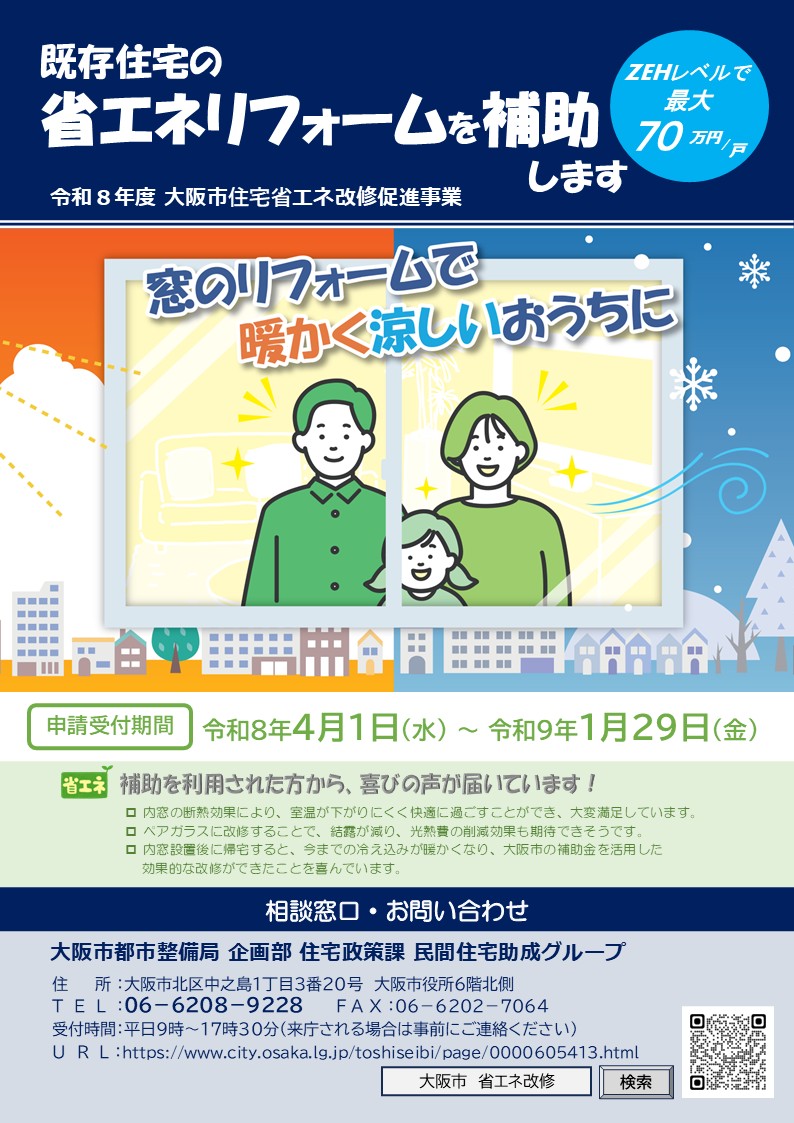 2050年の脱炭素社会「ゼロカーボン おおさか」の実現に向け、住宅ストックの省エネルギー性能の向上を図るため、民間の既存の戸建・共同住宅の所有者に対し、開口部(外気に接する窓又はドア)等の省エネ改修工事費の一部を補助します。