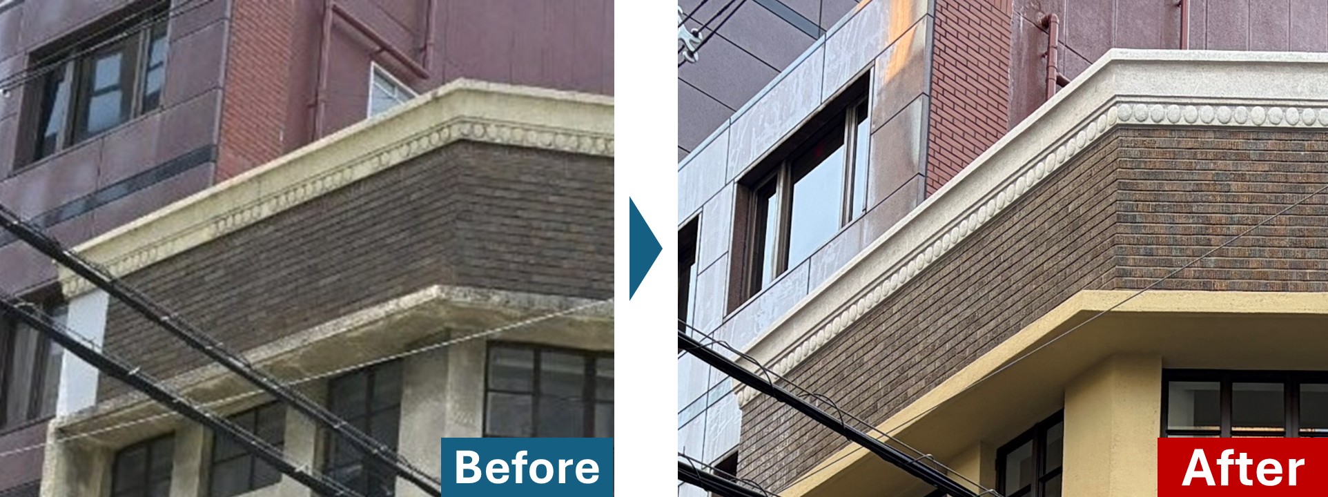 - 破損部のコーニス(建物外壁の最上部に設けられた横方向の装飾)を復原しました。