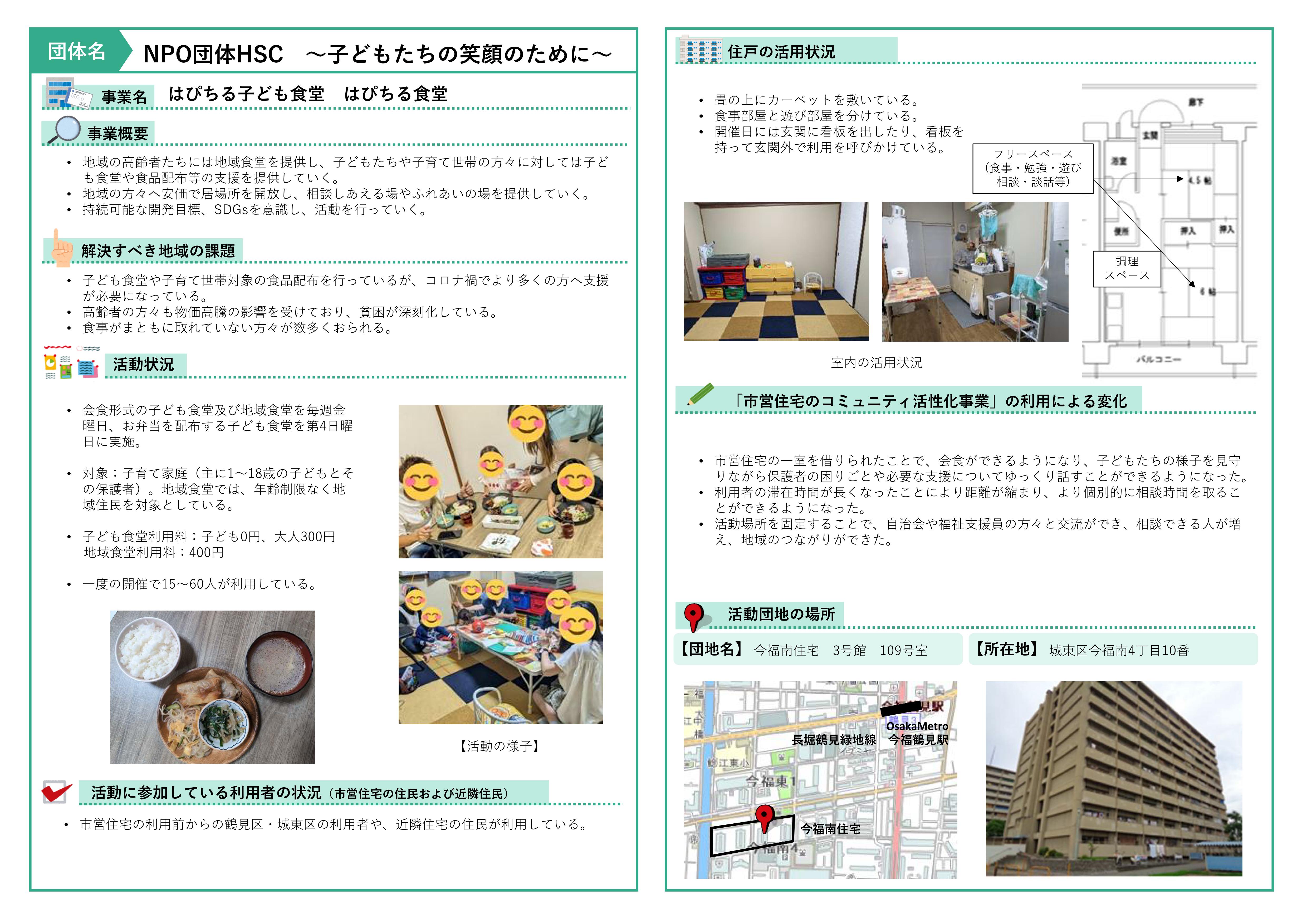 - 城東区 今福南住宅3号館109号室 NPO団体HSC ~子どもたちの笑顔のために~ (事業区分 高齢者、子育て)