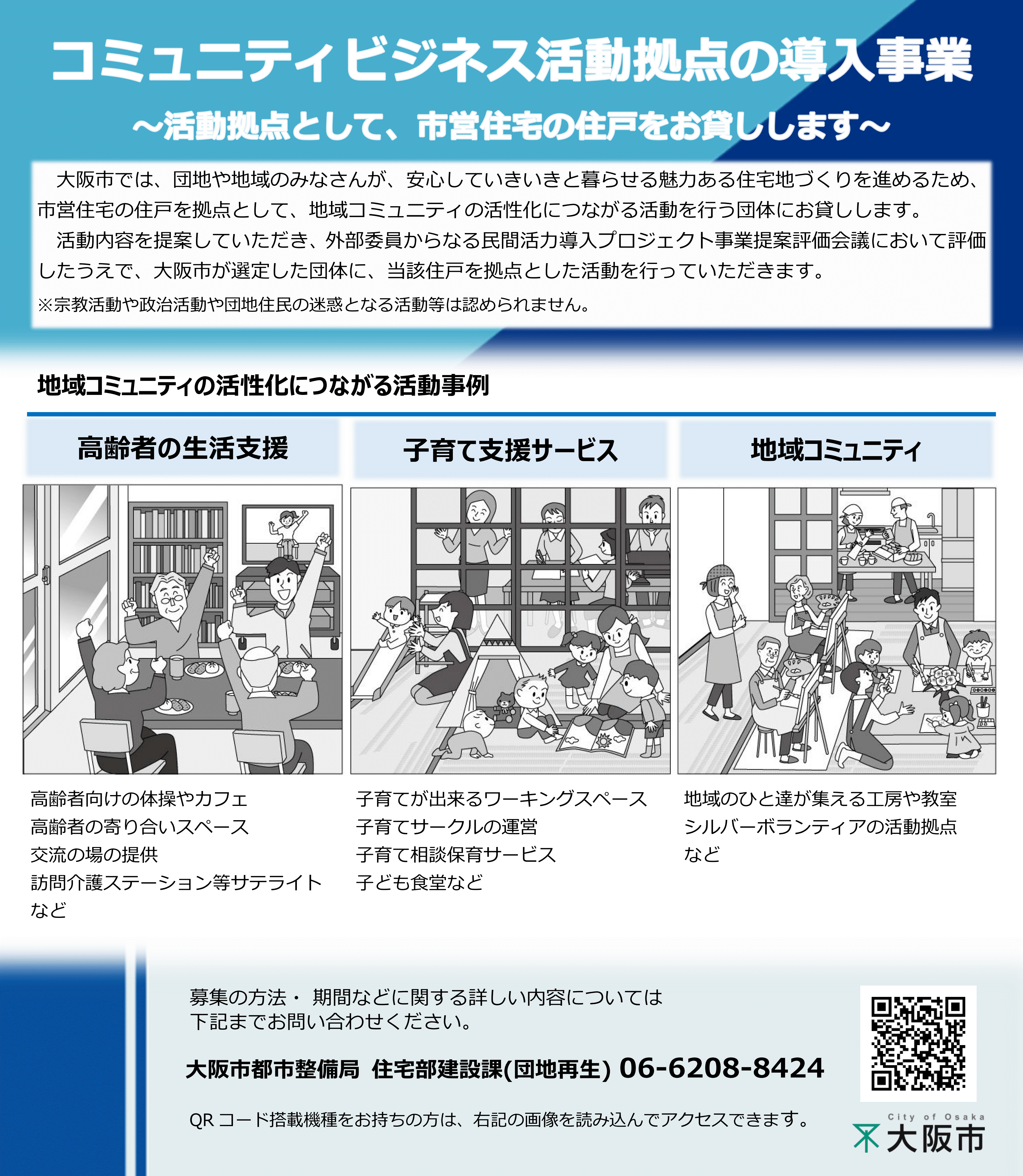 大阪市では、市営住宅団地において、高齢者の生活支援や子育てサービスの提供など、団地や地域の活性化につながるコミュニティビジネス等の活動拠点として、NPO等の団体に市営住宅の空き住戸を提供しています。