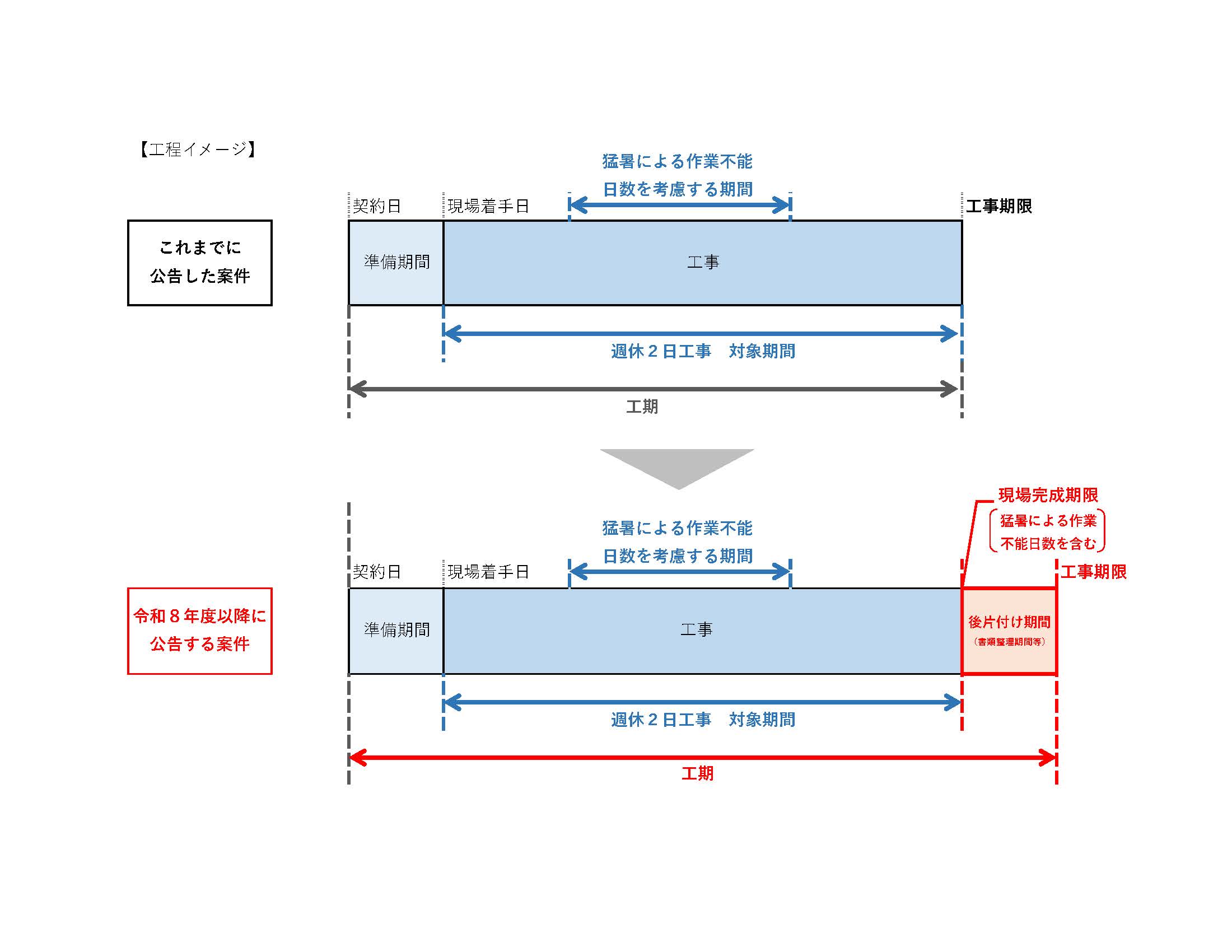 また、令和8年度からは、全ての工事において、「現場完成期限(※1)」および「後片付け期間(書類整理期間等)(※2)」を設け、建設業の労働環境の改善への取り組みを進めるため、余裕のある工期の確保に努めます。