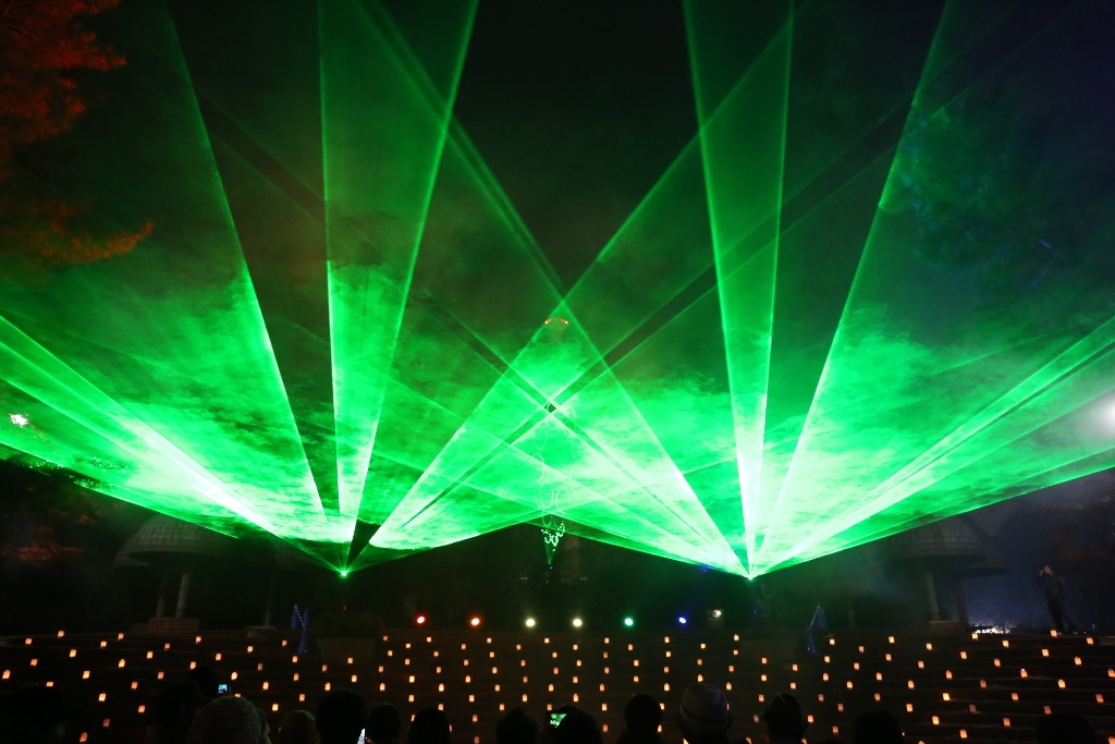 夜の部では、イベントサポーターの皆さんにもお手伝いいただき設置した2500個のろうそく行灯が、花桟敷一帯を淡く照らし、鮮やかな緑色のレーザー光が夜空を彩る幻想的な空間となりました。