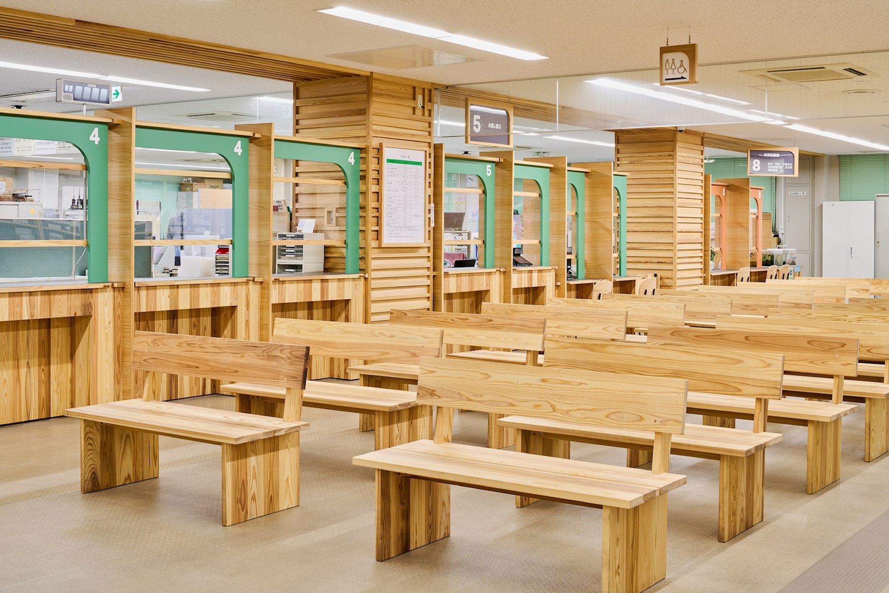 鶴見区役所では、令和4年度に、主に大阪府内産の木材を活用し、1階総合案内・住民情報待合スペース、地下1階フリースペースなどの内装木質化、窓口カウンターや待合ベンチなどの木製什器への更新を行いました。