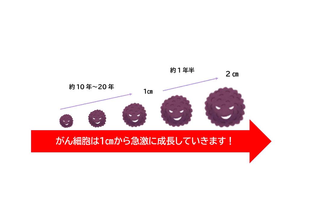 がんが発見できる1センチの大きさになるまでには、10年から20年かかりますが、1センチから2センチの大きさになるまでには、1年半しかかかりません。