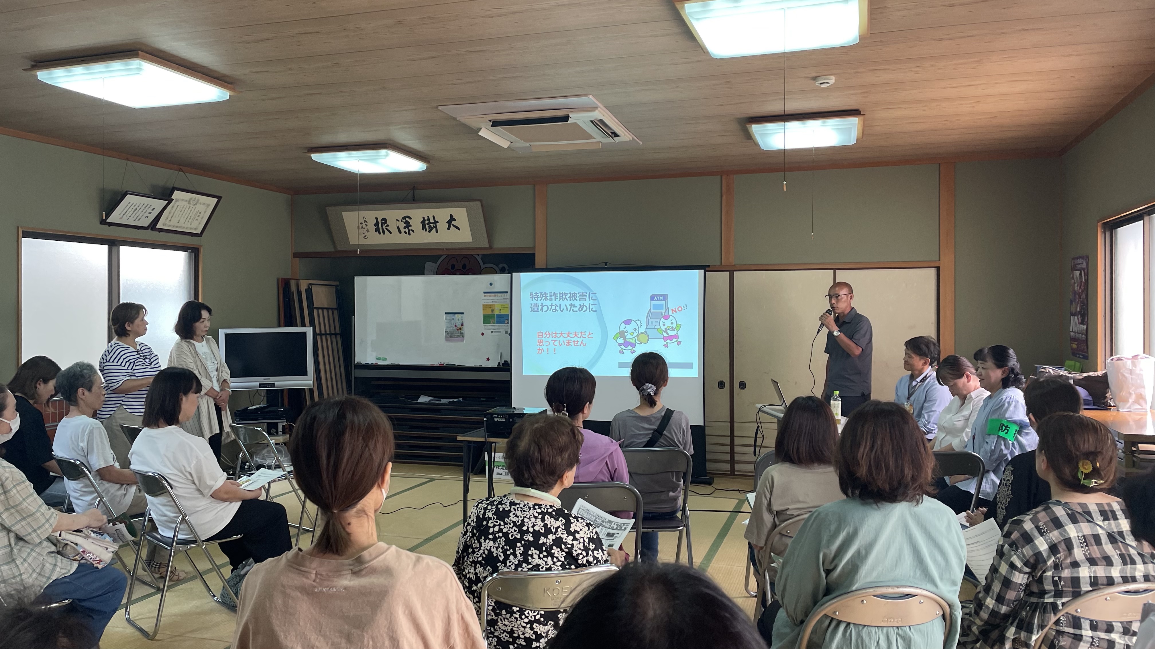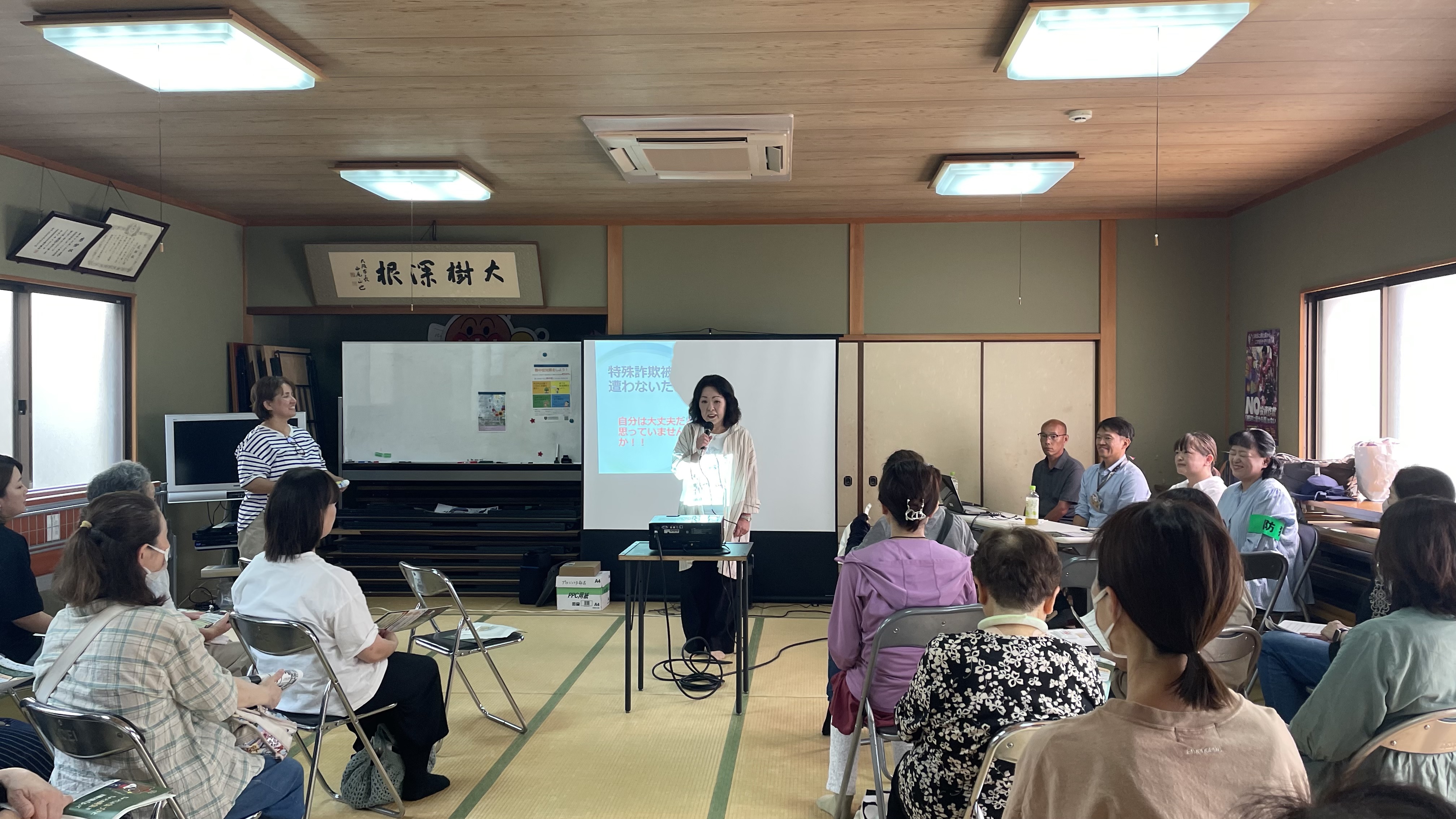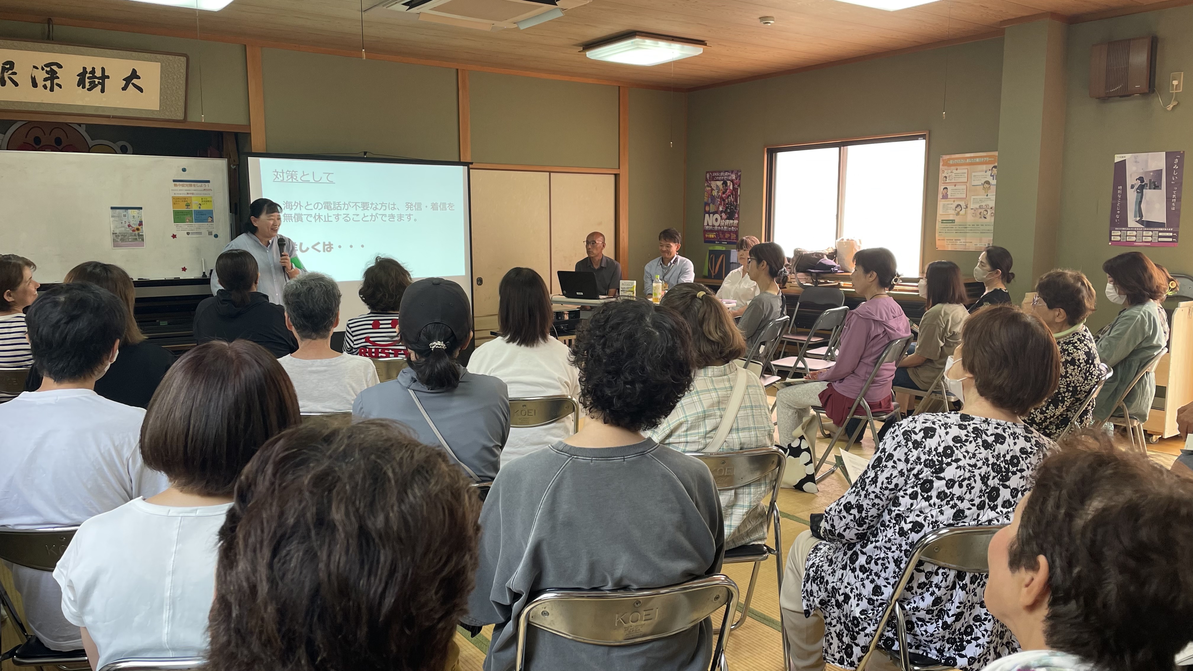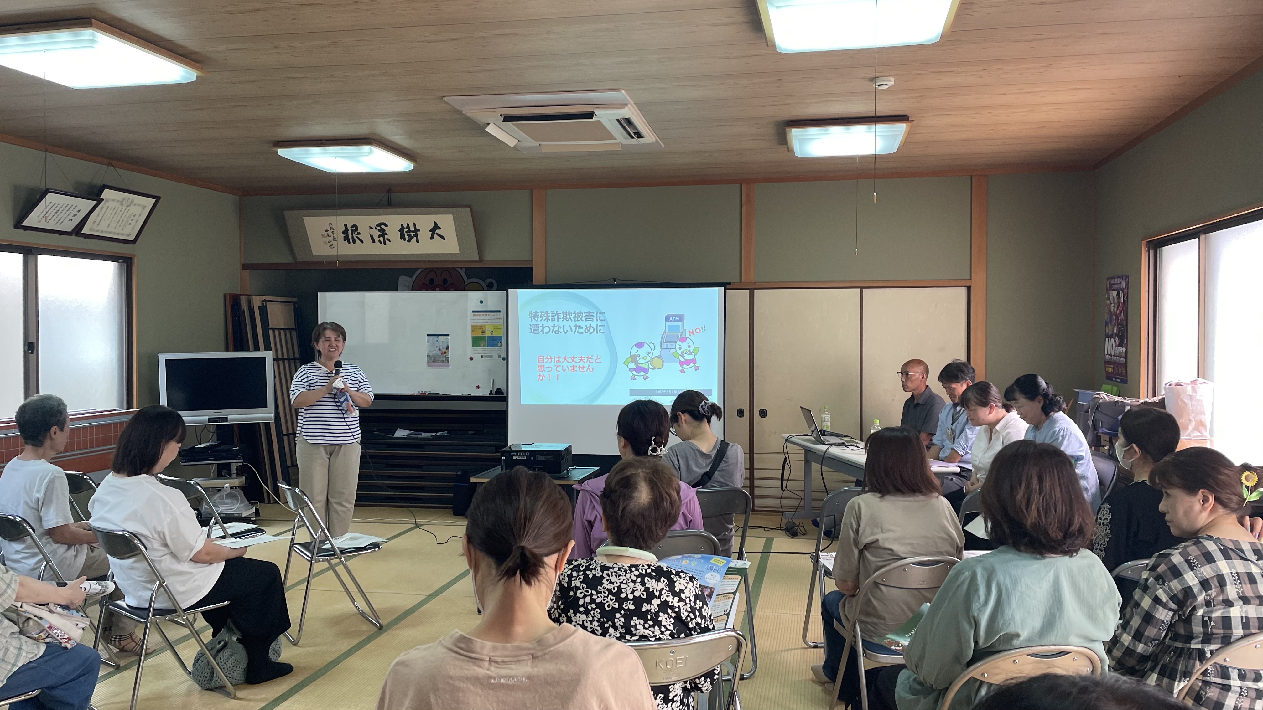 令和7年7月3日(木曜日)午後1時30分から茨田北福祉会館において、防犯出前講座を実施しました。鶴見区内においても新たな特殊詐欺手口が発生しています。「SNS型投資詐欺」や「SNS型ロマンス詐欺」、昨年度より急増している「オレオレ詐欺」の被害件数及び被害金額などの報告を行いました。詐欺手口については、より伝わるようにスライドを用いて事例を紹介し、注意喚起を行いました。また、鶴見警察署からは、専門的な知識から特殊詐欺対策のお話がありました。今後も地域に向けた防犯出前講座を鶴見警察署に協力を得ながら実施していきます。
