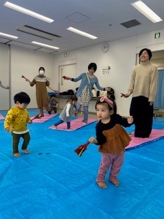 ママと一緒に鳴子やすずなどの楽器を音楽に合わせて鳴らしたり身体を動かすことを楽しんだり、ちょっぴりママの元を離れて1人でお散歩したり!