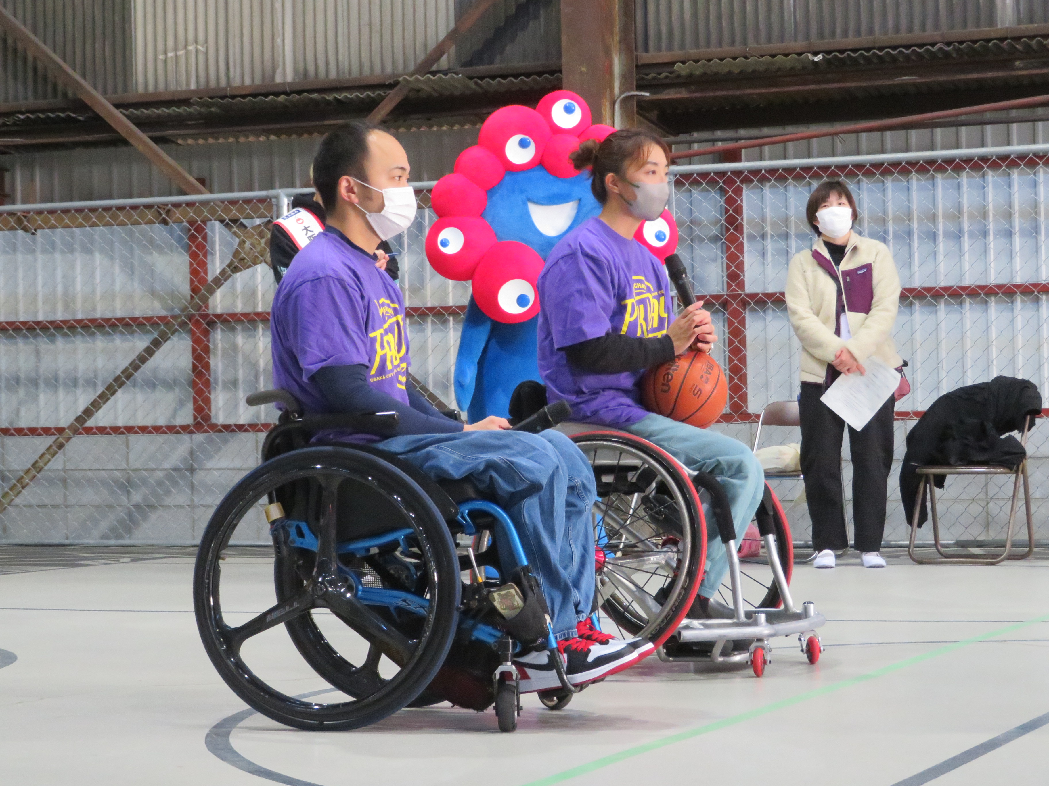 車いすバスケの選手に教わりながらシュートチャレンジ