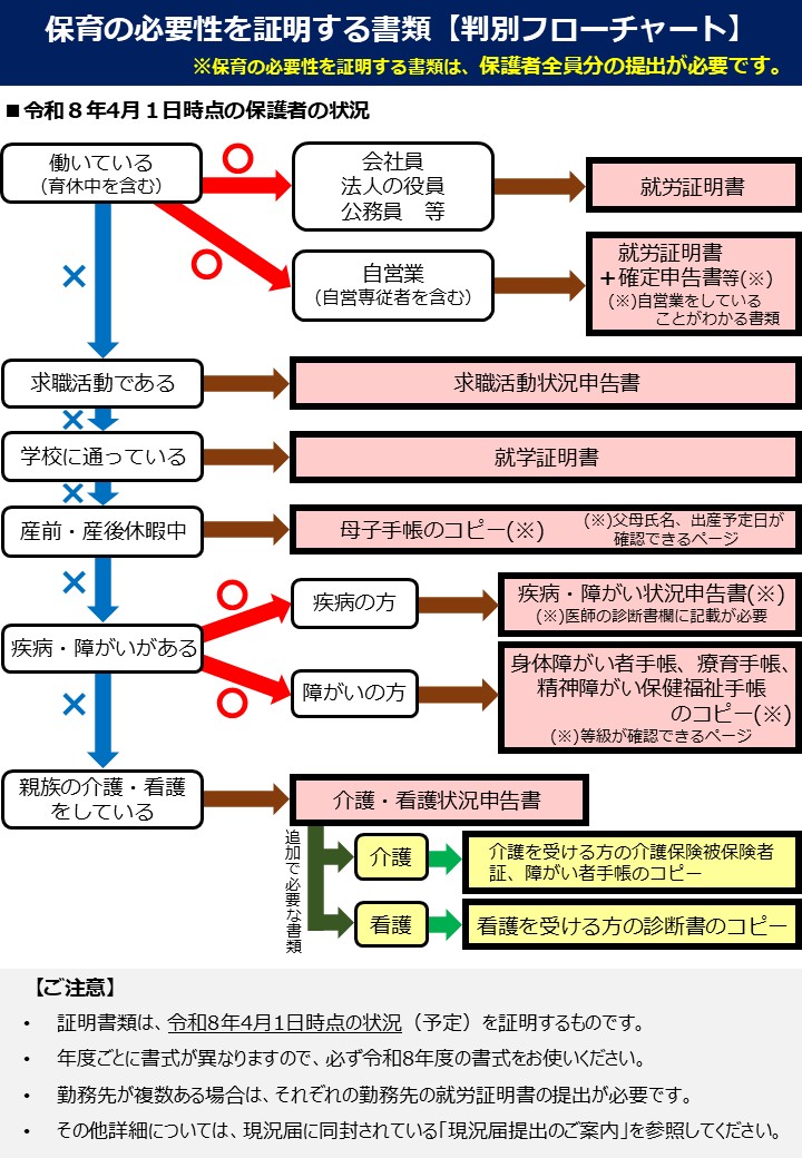 - 保育が必要な理由を証明する書類(詳しくは下のフローチャートを確認してください。)