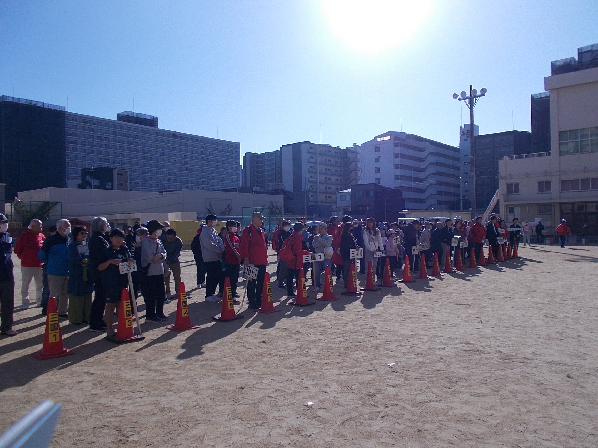 校庭に町会ごとに整列し、三前三国連合振興町会・地域活動協議会会長、仲田三国小学校校長、畑中副区長のあいさつが行われ、淀川消防署より訓練概要の説明があり、訓練開始です。