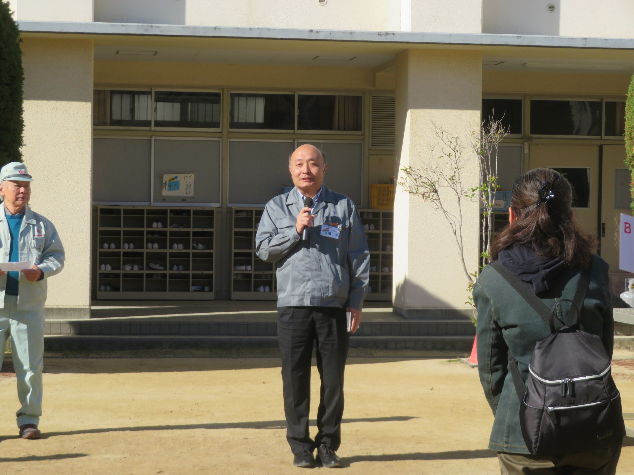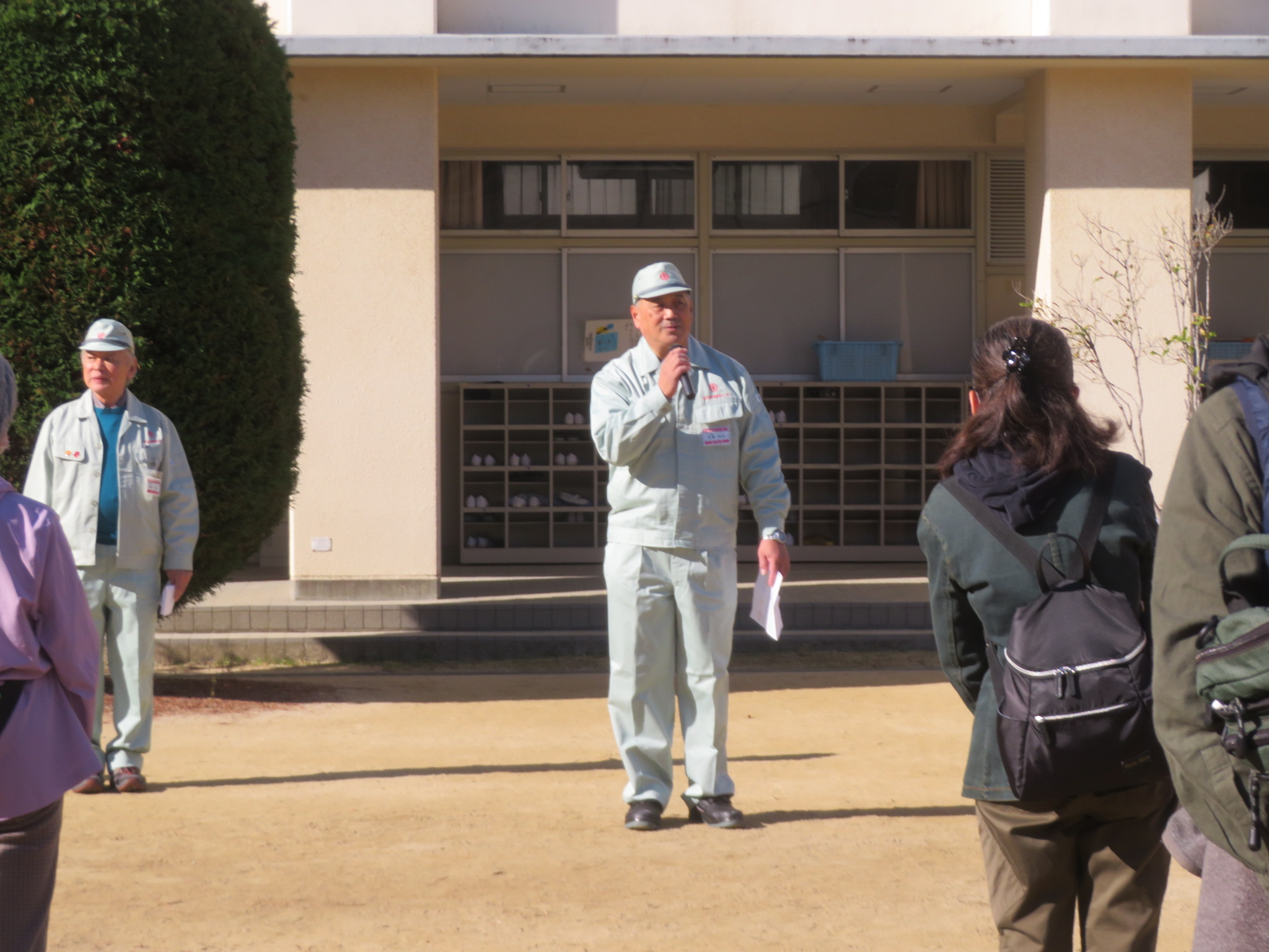 校庭に町会ごとに整列し、淀川区 畑中副区長のあいさつが行われ、防災リーダーより訓練内容について説明があり、訓練開始です。
