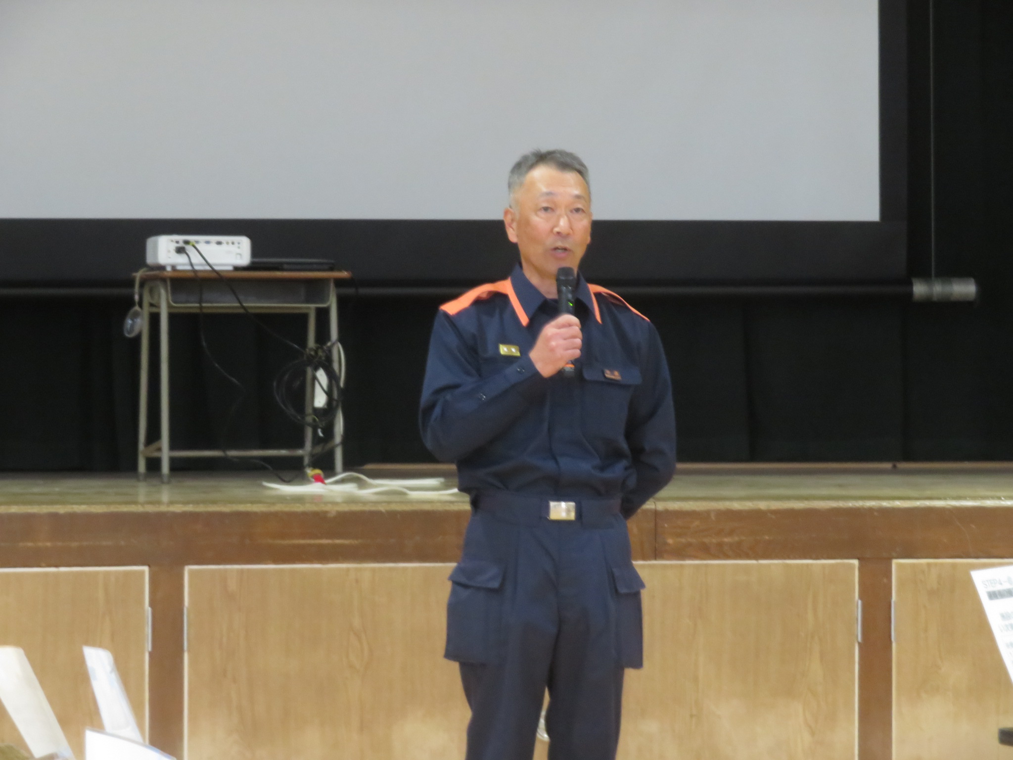 小学校講堂にて中道消防署長の訓練講評をうけ、訓練終了となりました。