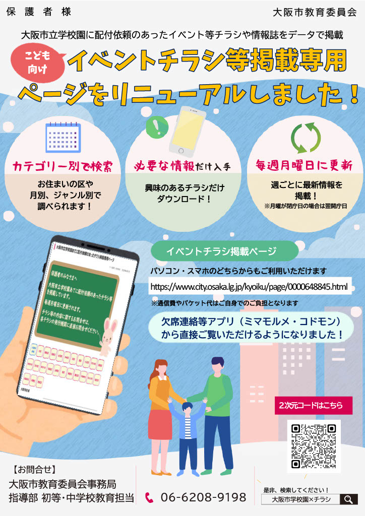 大阪市立学校園あてに配付依頼のあったチラシ等を「こども向けイベントチラシ等掲載専用ページ」に掲載しています。