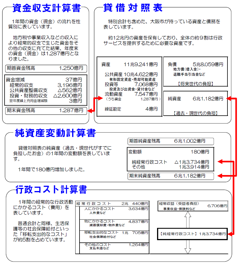 大阪市では、国が示した「総務省方式改訂モデル」に基づき、財務書類4表を作成・公表しています。